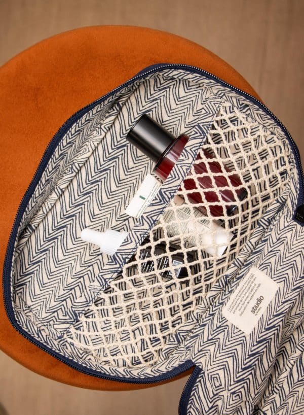 En coton 100% bio GOTS , il est idéal pour emporter tous ses produits favoris en vacances. En plus d’être élégant et coloré, il est pratique. En effet, son anse extérieure permet de le transporter facilement et son filet intérieur maintient tous les petits essentiels. Grâce à sa jolie doublure intérieure en coton, vos affaires de voyage seront bien protégées de vos produits de beauté.
