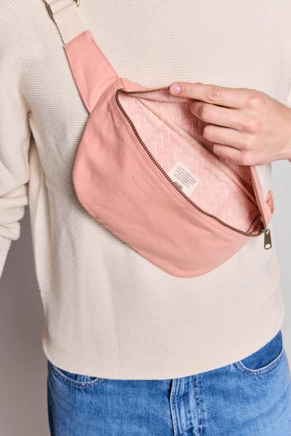 En coton 100% bio GOTS épais et solide, il vous permettra de transporter tout le contenu de votre sac à main de manière confortable et pratique. Grâce à son anse réglable en joli coloris écru, cette banane est portable aussi bien sur un manteau épais en hiver que sur un t-shirt léger l’été.