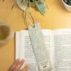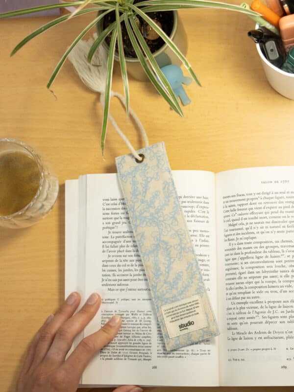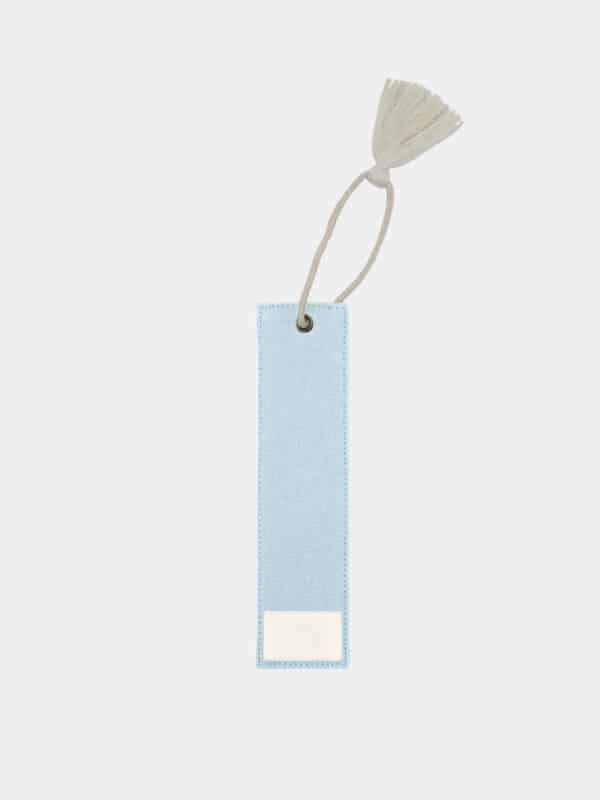 Marque-page en coton biologique certifié GOTS, conçu avec un renfort pour assurer une bonne rigidité et un maintien parfait entre les pages. Son élégante ficelle ornée d’un pompon dépasse délicatement du livre, ajoutant une touche esthétique.