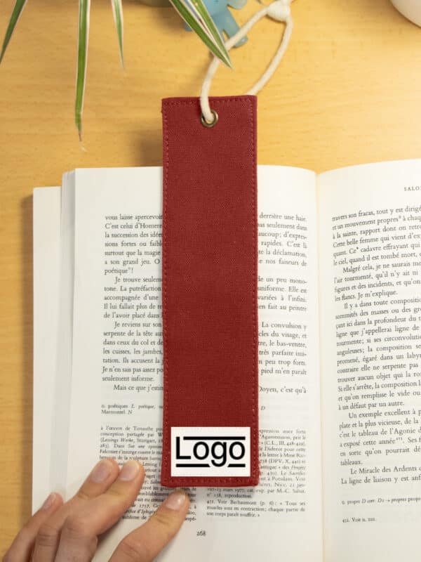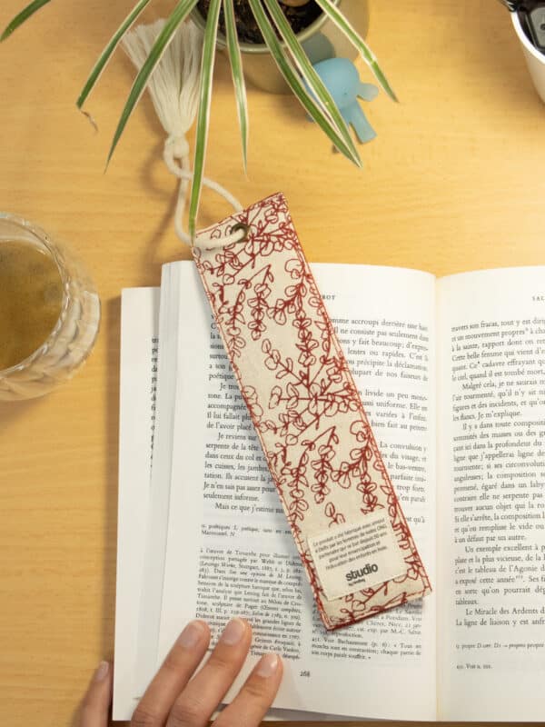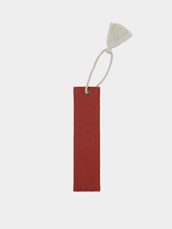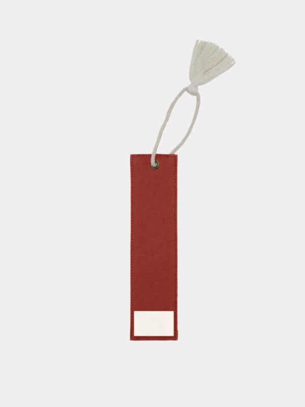 Marque-page en coton biologique certifié GOTS, conçu avec un renfort pour assurer une bonne rigidité et un maintien parfait entre les pages. Son élégante ficelle ornée d’un pompon dépasse délicatement du livre, ajoutant une touche esthétique.