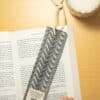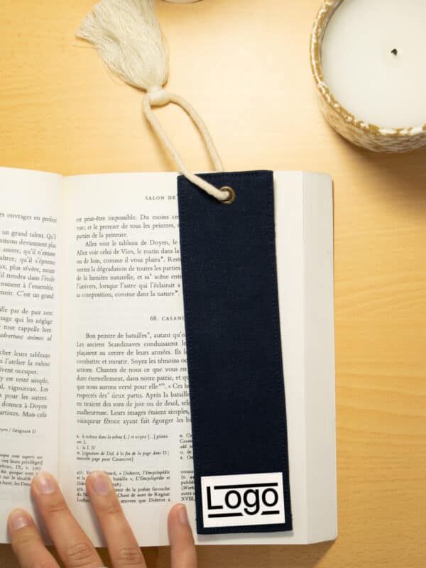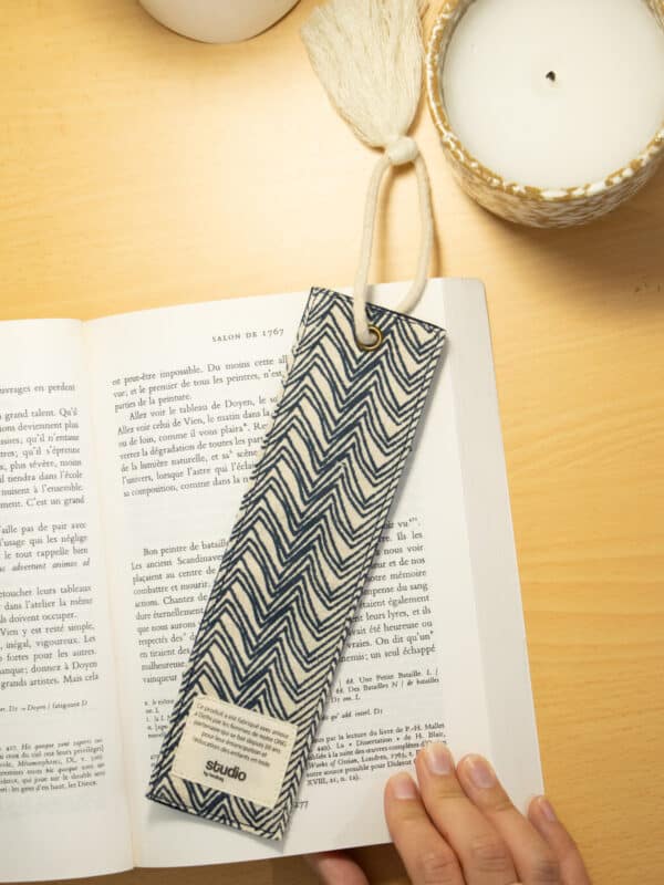 Marque-page en coton biologique certifié GOTS, conçu avec un renfort pour assurer une bonne rigidité et un maintien parfait entre les pages. Son élégante ficelle ornée d’un pompon dépasse délicatement du livre, ajoutant une touche esthétique.