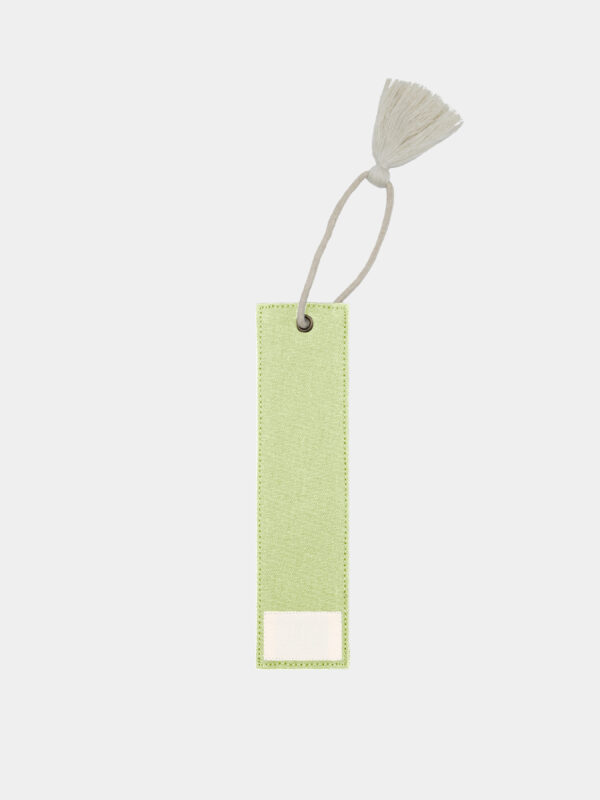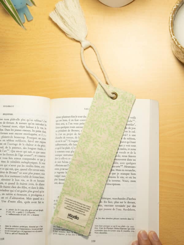 Marque-page en coton biologique certifié GOTS, conçu avec un renfort pour assurer une bonne rigidité et un maintien parfait entre les pages. Son élégante ficelle ornée d’un pompon dépasse délicatement du livre, ajoutant une touche esthétique.