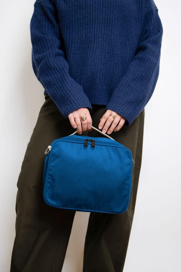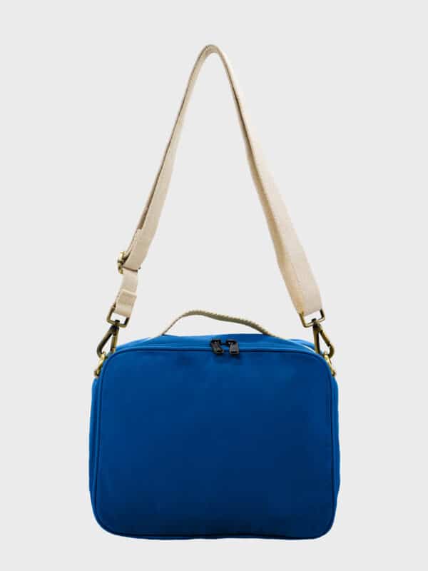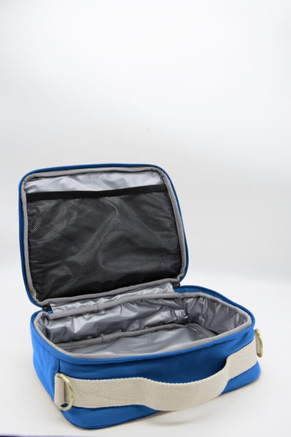 Sa poignée centrale et sa bandoulière réglable et amovible offrent un portage confortable. À l’intérieur, un filet élastique maintient vos contenants, et une poche plaquée au dos accueille vos indispensables comme serviette, petits biscuits, couverts…