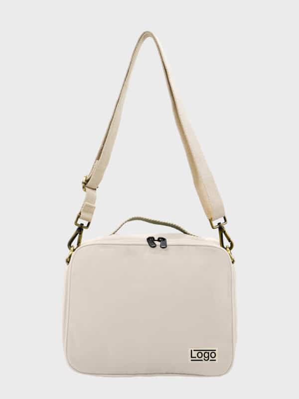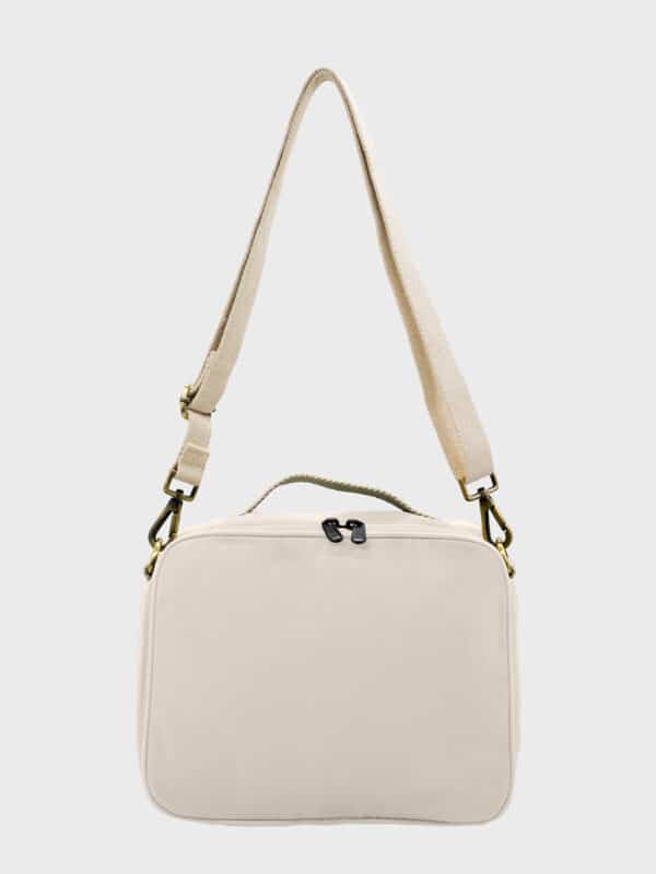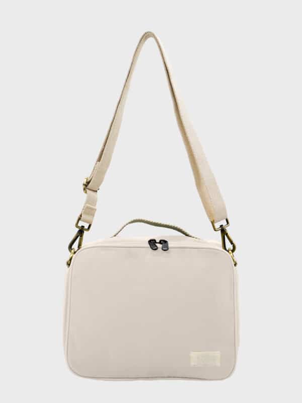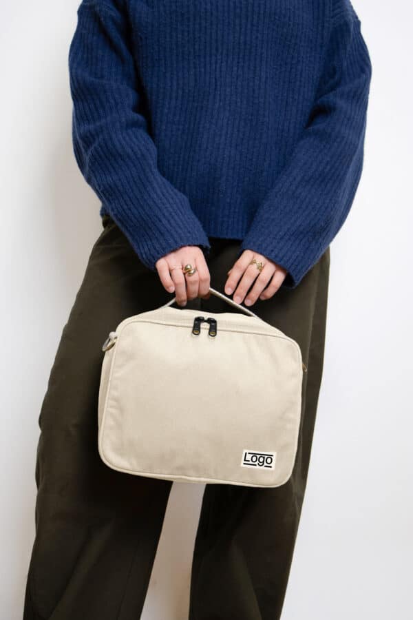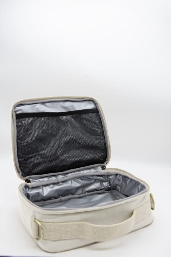 Sa poignée centrale et sa bandoulière réglable et amovible offrent un portage confortable. À l’intérieur, un filet élastique maintient vos contenants, et une poche plaquée au dos accueille vos indispensables comme serviette, petits biscuits, couverts…