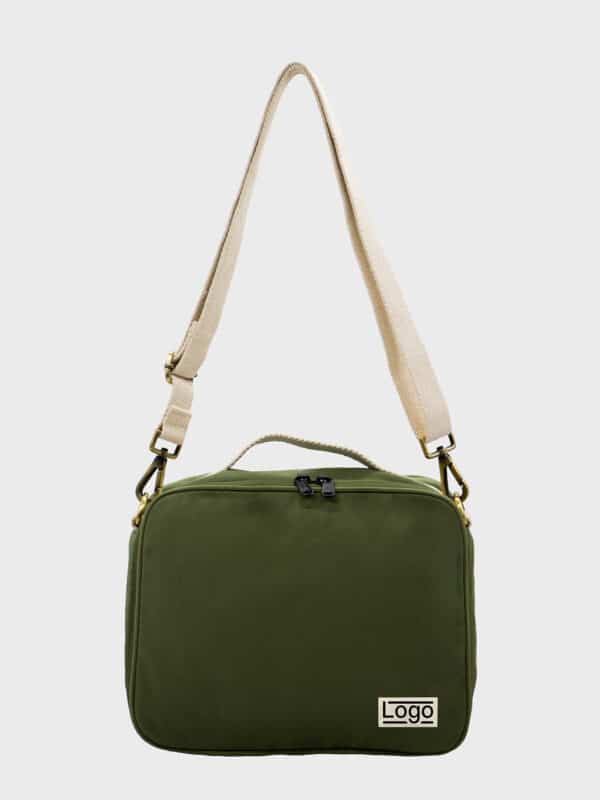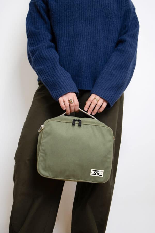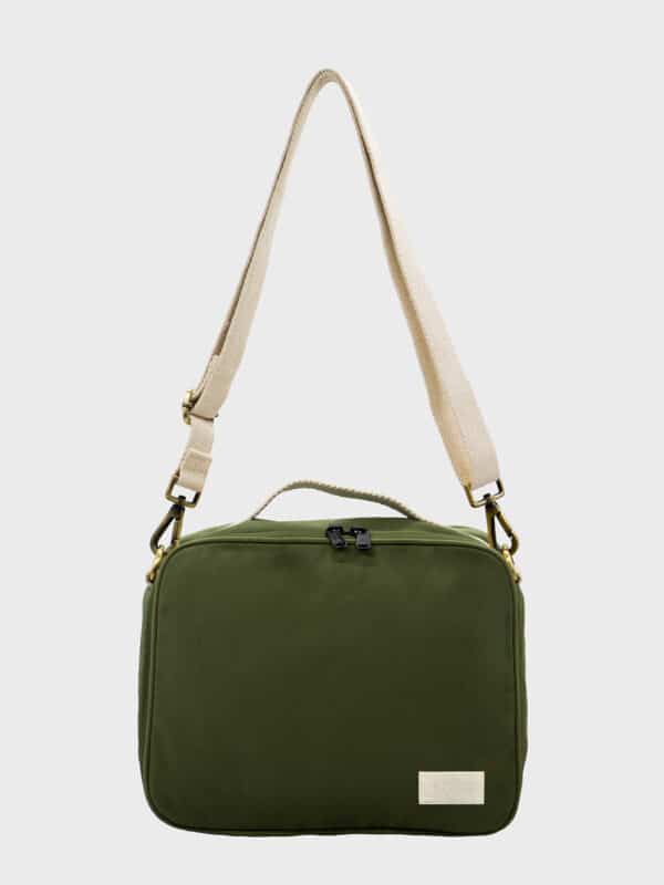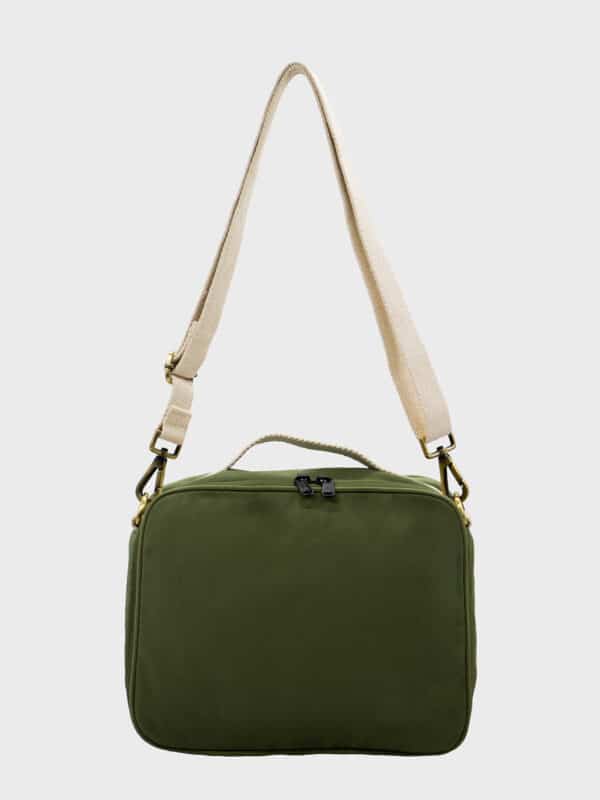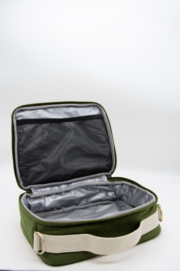 Sa poignée centrale et sa bandoulière réglable et amovible offrent un portage confortable. À l’intérieur, un filet élastique maintient vos contenants, et une poche plaquée au dos accueille vos indispensables comme serviette, petits biscuits, couverts…
