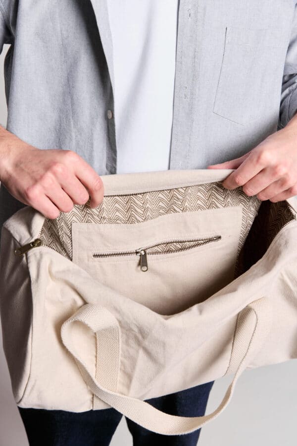 Notre grand sac polochon Sam 100% coton bio GOTS est un indispensable pour partir en escapade ou encore pour aller à la salle de sport. Dans sa poche intérieure avec fermeture, vous pourrez ranger vos petits essentiels à avoir à portée de main.