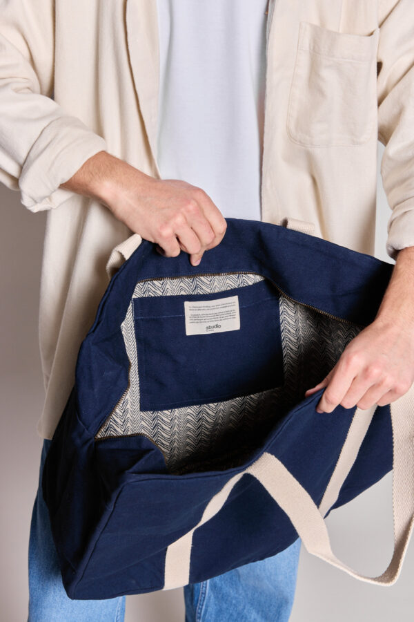 En coton 100% bio GOTS épais et solide, il dispose d'une grande fermeture éclair qui vous permettra de transporter en toute sécurité vos précieuses affaires. Sa doublure aux motifs imprimés lui apporte originalité et élégance. Petit plus : sa poche intérieure plaquée afin d'y glisser ses essentiels à avoir à portée de main.