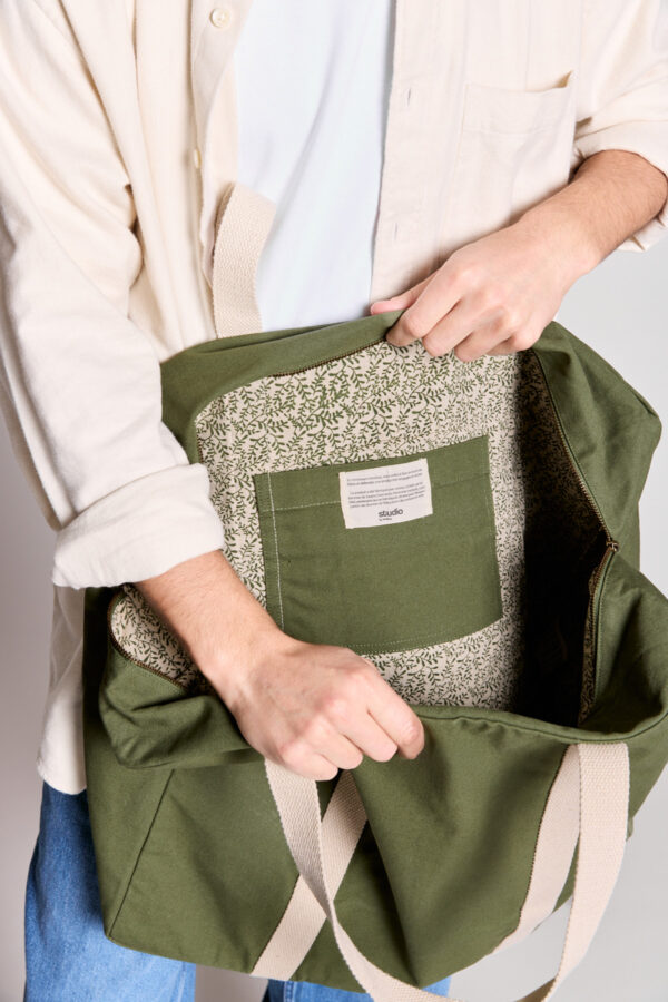 En coton 100% bio GOTS épais et solide, il dispose d'une grande fermeture éclair qui vous permettra de transporter en toute sécurité vos précieuses affaires. Sa doublure aux motifs imprimés lui apporte originalité et élégance. Petit plus : sa poche intérieure plaquée afin d'y glisser ses essentiels à avoir à portée de main.