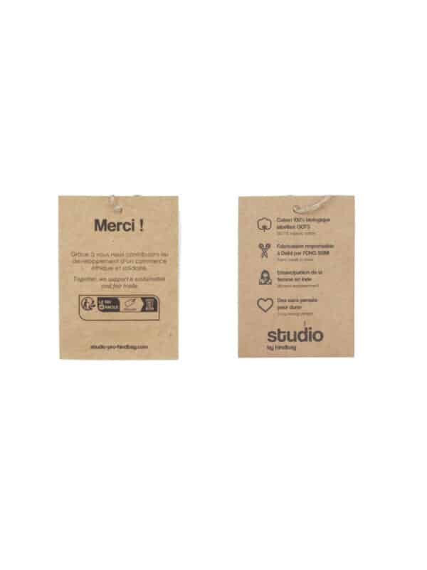 Chaque produit présente une étiquette intérieure cousue, explicative du projet social.